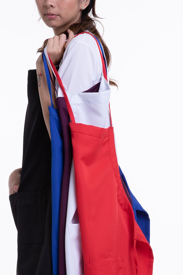 Basic full apron with adjustable drawstring strap with patch pocket.